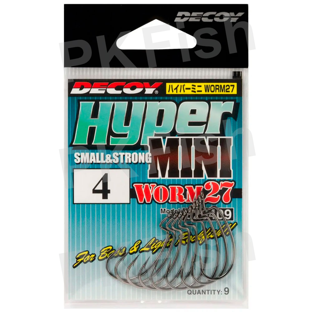 Гачок Decoy Worm27 Hyper Mini побудований на базі популярного офсетника Worm13, але випускається у розмірах, розрахованих на невеликі силіконові приманки. Незважаючи на свої незначні габарити, він здатний витримувати високі навантаження, що виникають при виважуванні риби. Форма вигину зроблена таким чином, що жало лягає на спину приманки і моментально вивільняється при клюванні. Посадкова частина для силікону має трохи більшу довжину, ніж зазвичай, що позитивно позначається на утриманні приманки на гачку.
