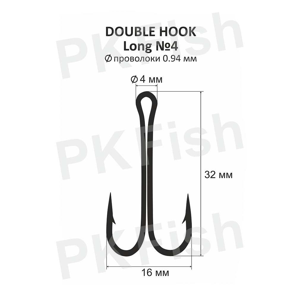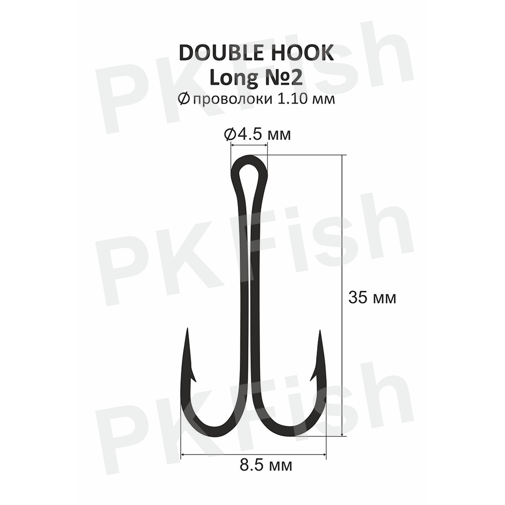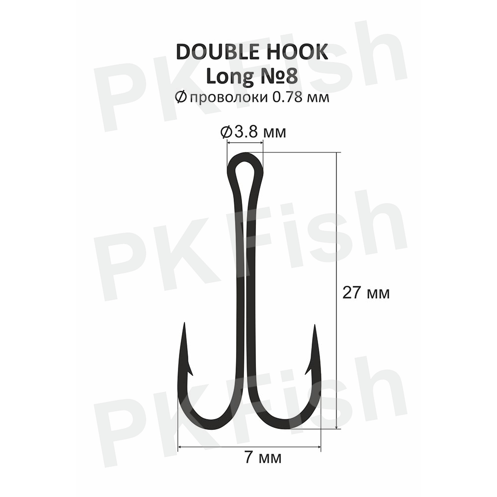 Подовжений двійник (double hook) відмінно підходить для полювання за хижою рибою. Неспаяний (цілісний), з подовженою цівкою гачок має розведені під 90 градусів спеціально заточені жала. Виготовлений з дуже якісної високовуглецевої сталі, виробленої в Кореї, яка нічим не поступається японській. Має бездоганну якість і пронизуючі жала. При клюванні впевнено тримає будь-яку рибу. Рекомендовано використання із середнім і великим розміром силіконових приманок. Даний тип гачка має спеціальне антикорозійне покриття, чорний хром, зберігаючи якість гачка навіть при використанні його в солоній воді.