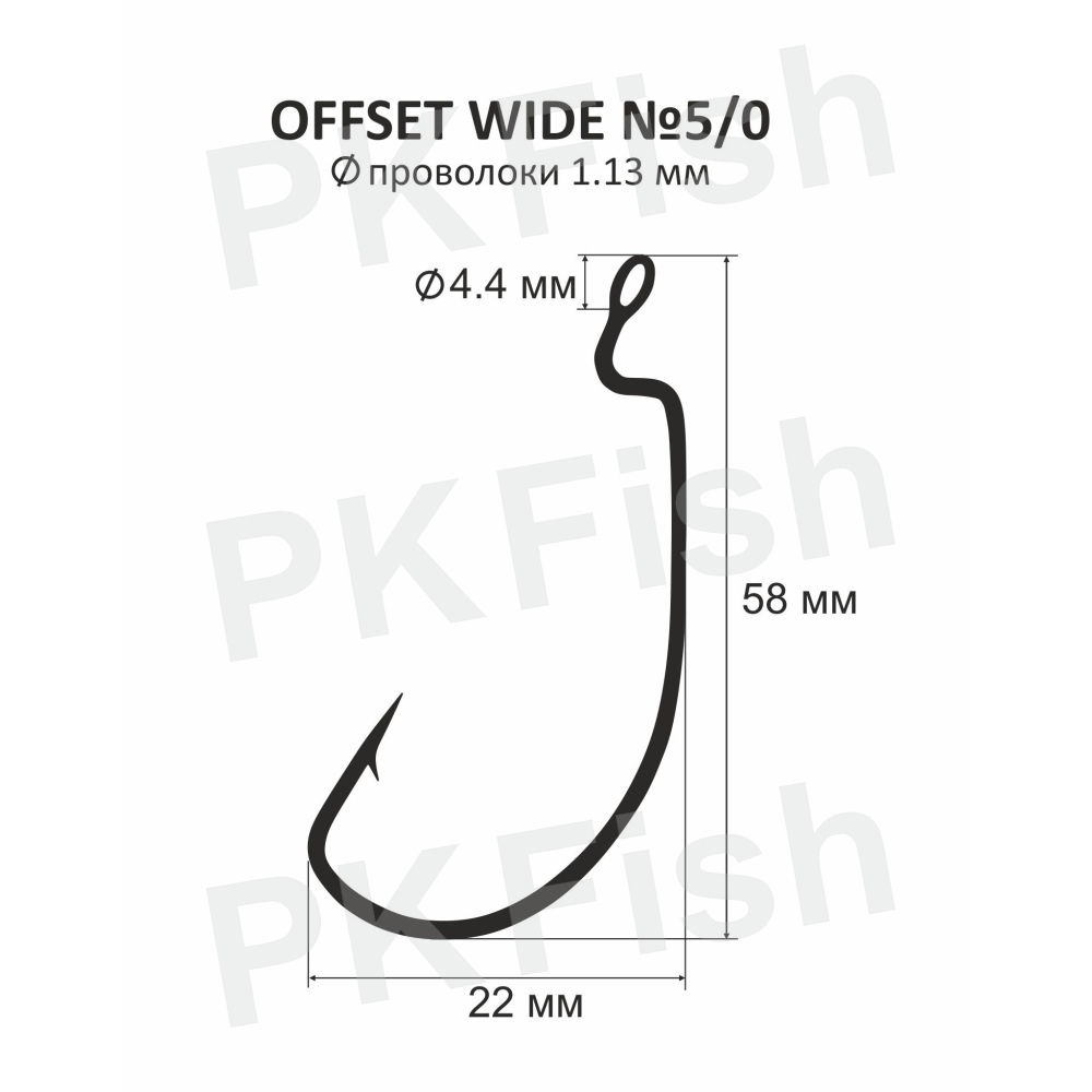 Офсетний рибальський гачок (Offset hook) виготовлений з високовуглецевої сталі, виробленої в Кореї (аналогічна сталь використовується у виробництві японських гачків). Верхня частина цівки має спеціальний вигин, вміло приховує пронизливо гостре жало, що має хімічну заточку. З метою збільшення протидії розгинання проковано 2/3 довжини піддіву гачка. Гачок має спеціальне антикорозійне покриття (чорний хром), що дозволяє надовго зберегти його якість, навіть в солоній воді. На офсетному гачку форма вигину і глибина піддіву дозволяє капітально утримувати ніжну силіконову приманку будь-якого типу, на яку можна ловити в самих корчах і густо порослих водною рослинністю місцях, без ризику втратити снасть.